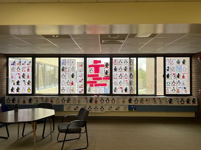 The students who met the goal colored pictures to celebrate and hung them up in the cafeteria.